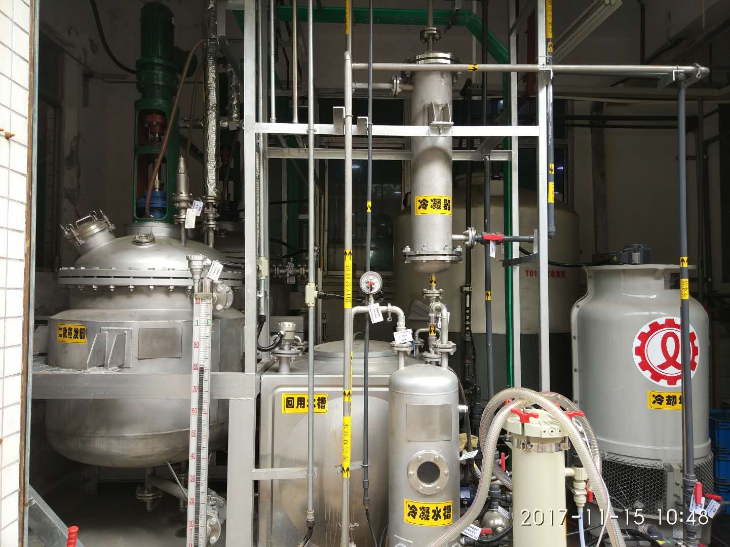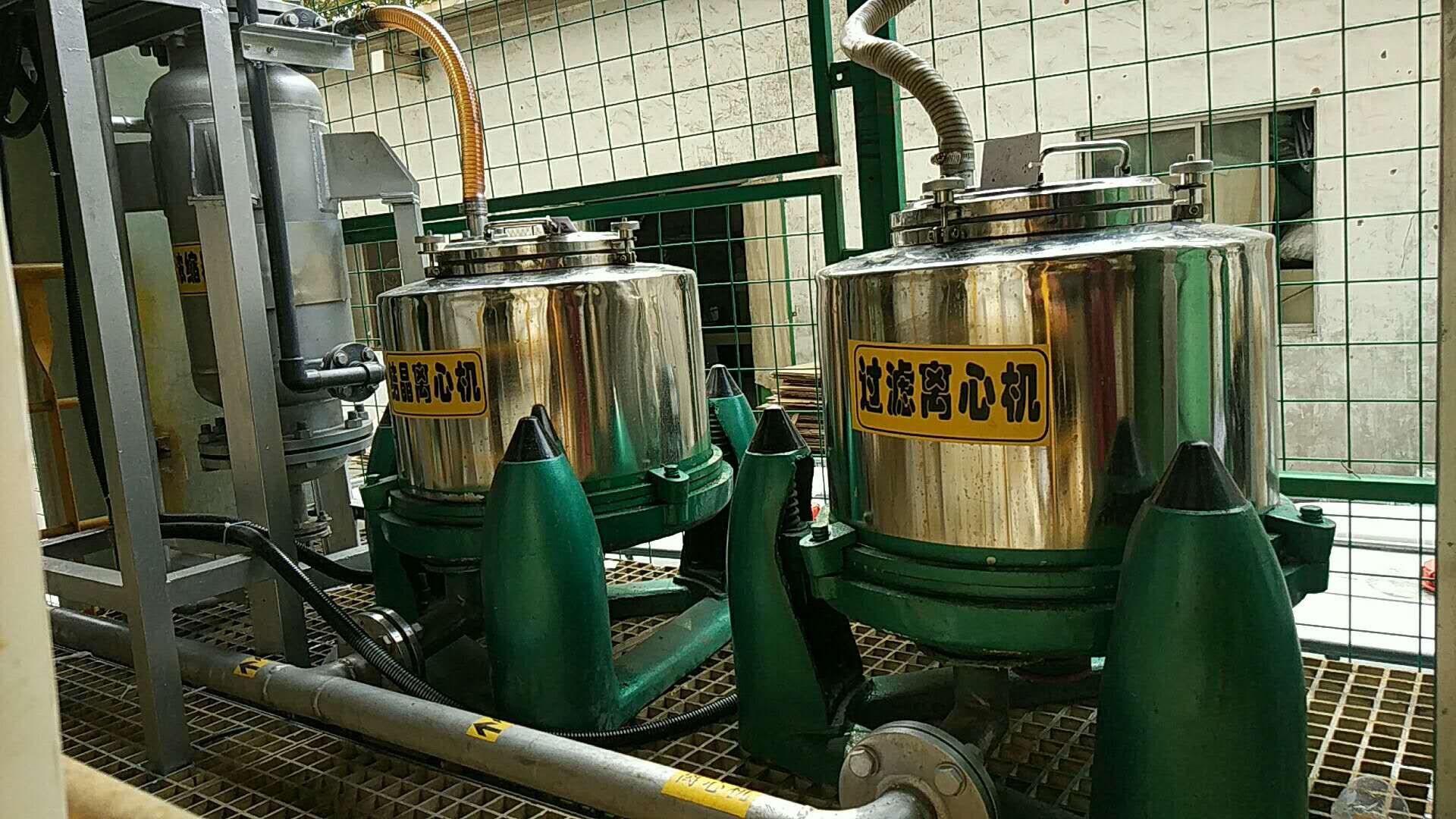 在反應(yīng)釜內(nèi)的濃液被濃縮到飽和時(shí),會(huì)有晶體析出,含晶體的混合液由泵打入離心機(jī)2中進(jìn)行固液分離,卸出的固體物質(zhì)委外處理,另外的飽和液回流至濃液槽中再次進(jìn)入蒸發(fā)器中。而蒸發(fā)出的蒸汽通過冷凝器進(jìn)行冷卻后,形成冷凝水,進(jìn)入回用水箱中,進(jìn)入車間回用。